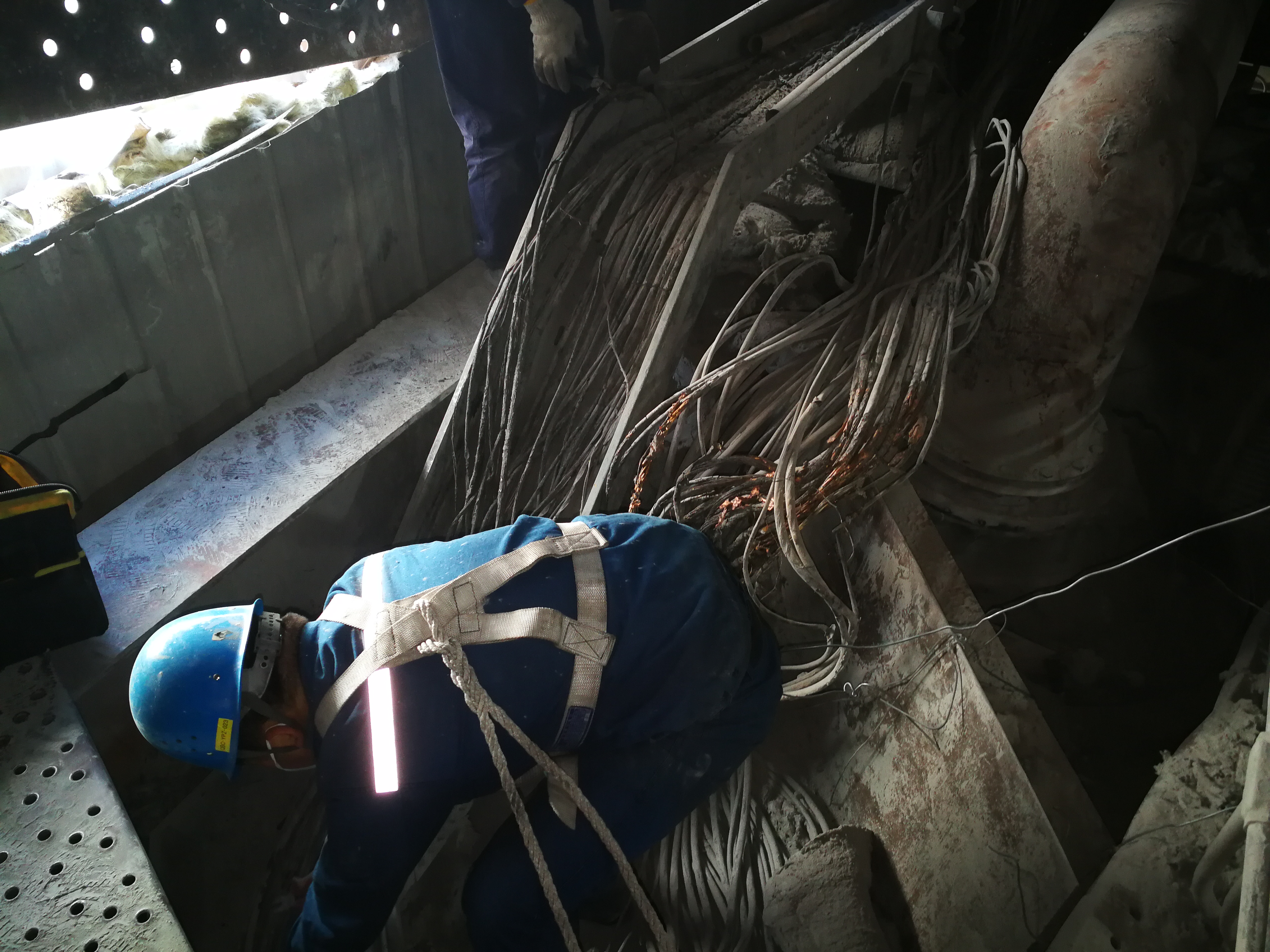清水川能源#2爐A側(cè)熱一次風(fēng)管道接口漏風(fēng),泄漏的熱風(fēng)將大量熱工測(cè)量電纜絕緣燒壞,5月9日,項(xiàng)目部組織人員全力以赴完成燒壞電纜的對(duì)接工作。