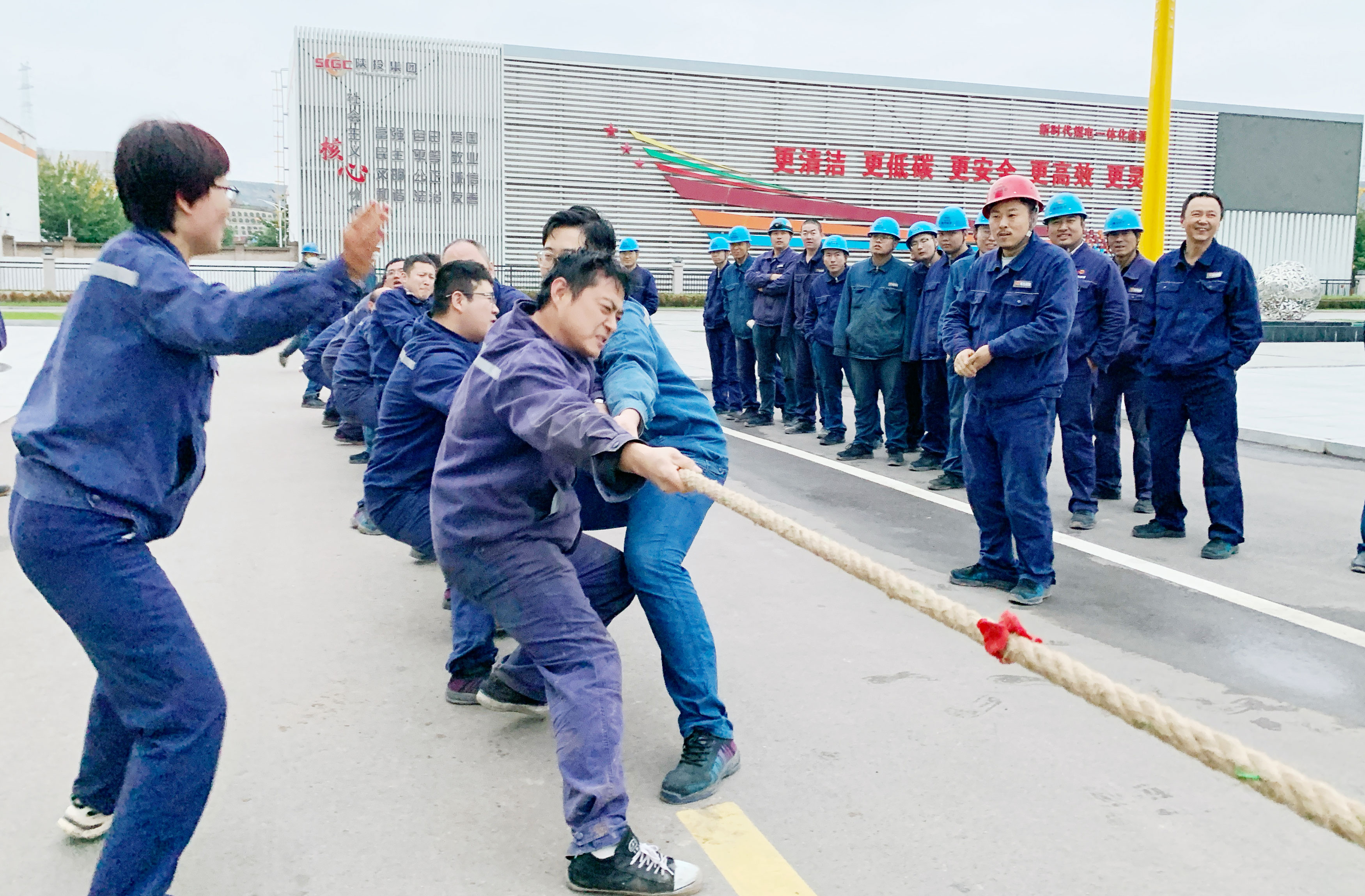 “加油!加油!”一聲聲助威吶喊之下,拔河比賽有條不紊地進行著,歡呼聲、掌聲響起,一點點驅散著職工的疲憊與秋雨中的寒意。雖然工作很辛苦,但是各專業(yè)隊伍依然情緒高漲,各個摩拳擦掌積極商討對策,都想要在比賽中拔得頭籌。