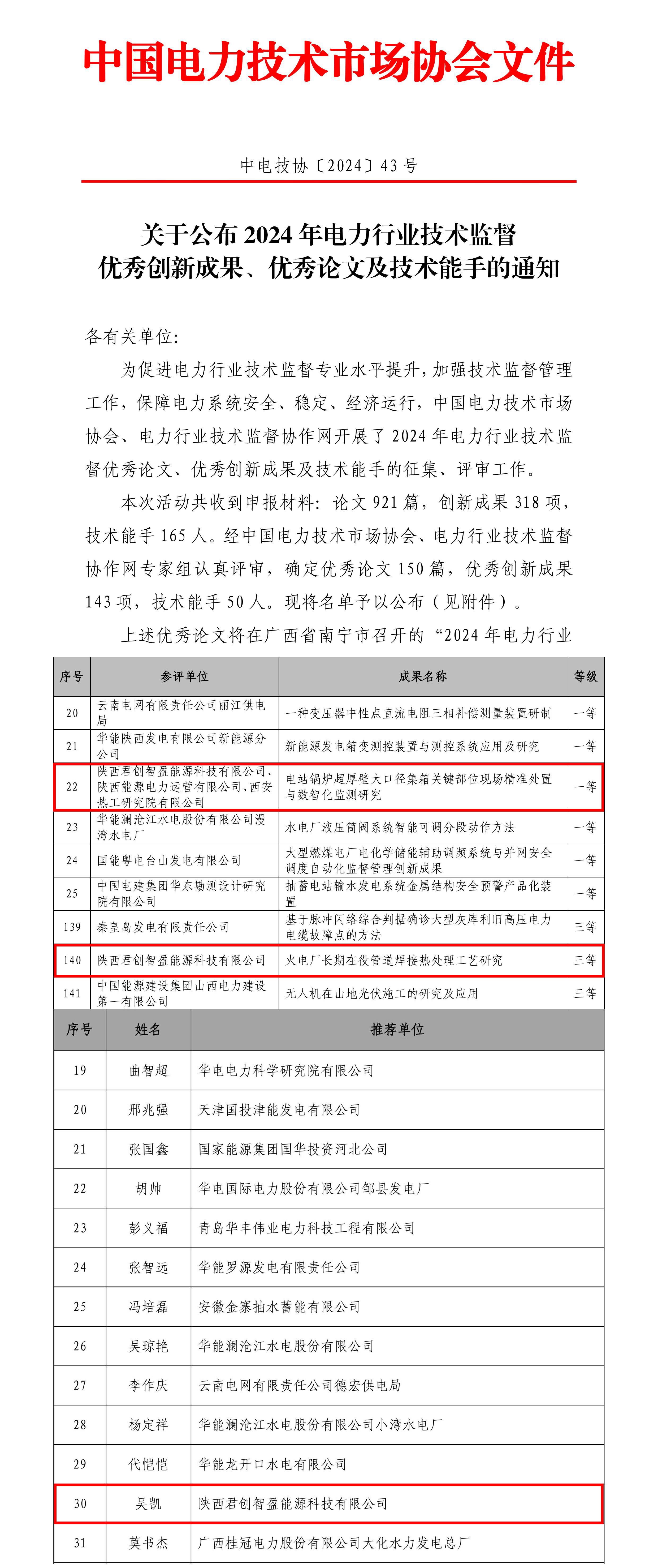 日前,君創(chuàng)科技《電站鍋爐超厚壁大口徑集箱關(guān)鍵部位現(xiàn)場精準(zhǔn)處置與數(shù)智化監(jiān)測研究》《火電廠長期在役管道焊接熱處理工藝研究》分獲中國電力技術(shù)市場協(xié)會2024年電力行業(yè)技術(shù)監(jiān)督優(yōu)秀創(chuàng)新成果一等獎、三等獎,吳凱獲技術(shù)能手稱號。