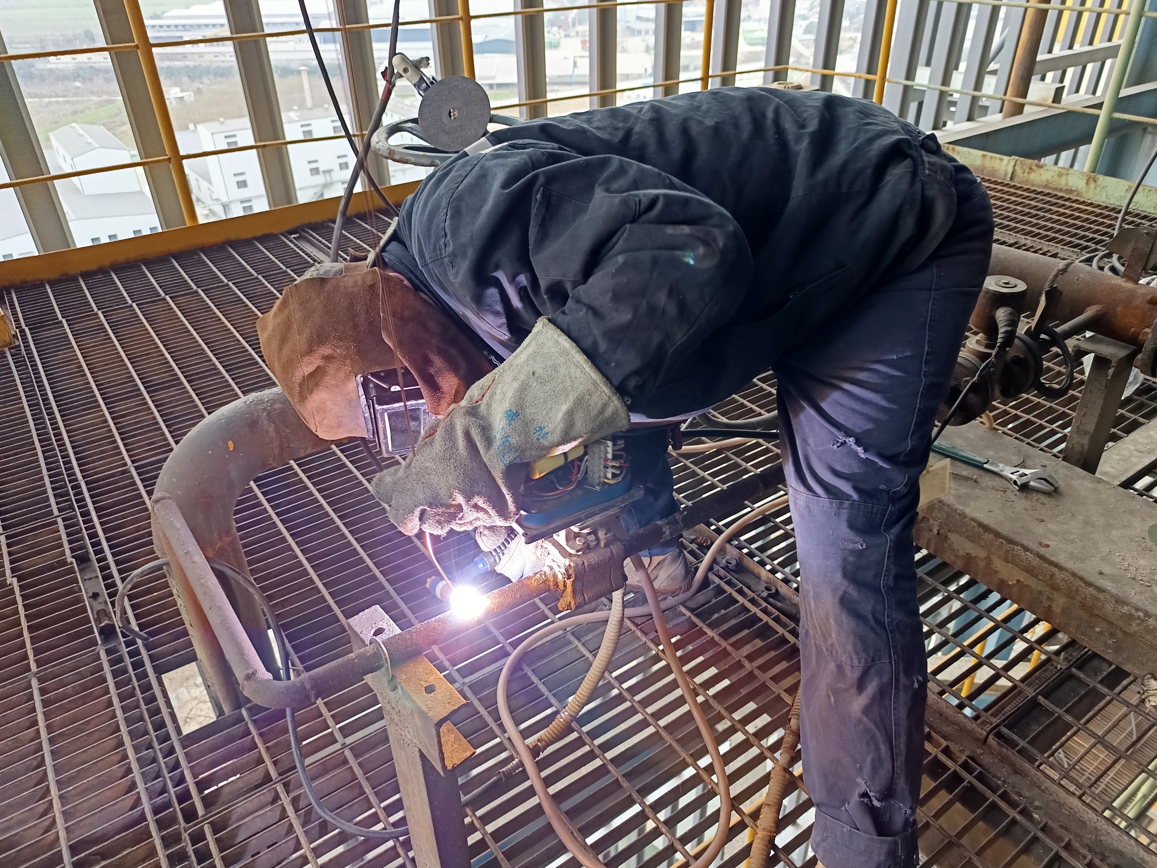 19日16:15,#6爐50米高的吹灰器乙炔管消漏現(xiàn)場,完成壓縮空氣吹掃、乙炔余氣測試等準備工作,“繡花匠”楊建拿起角磨機對焊口進行維護、打磨。