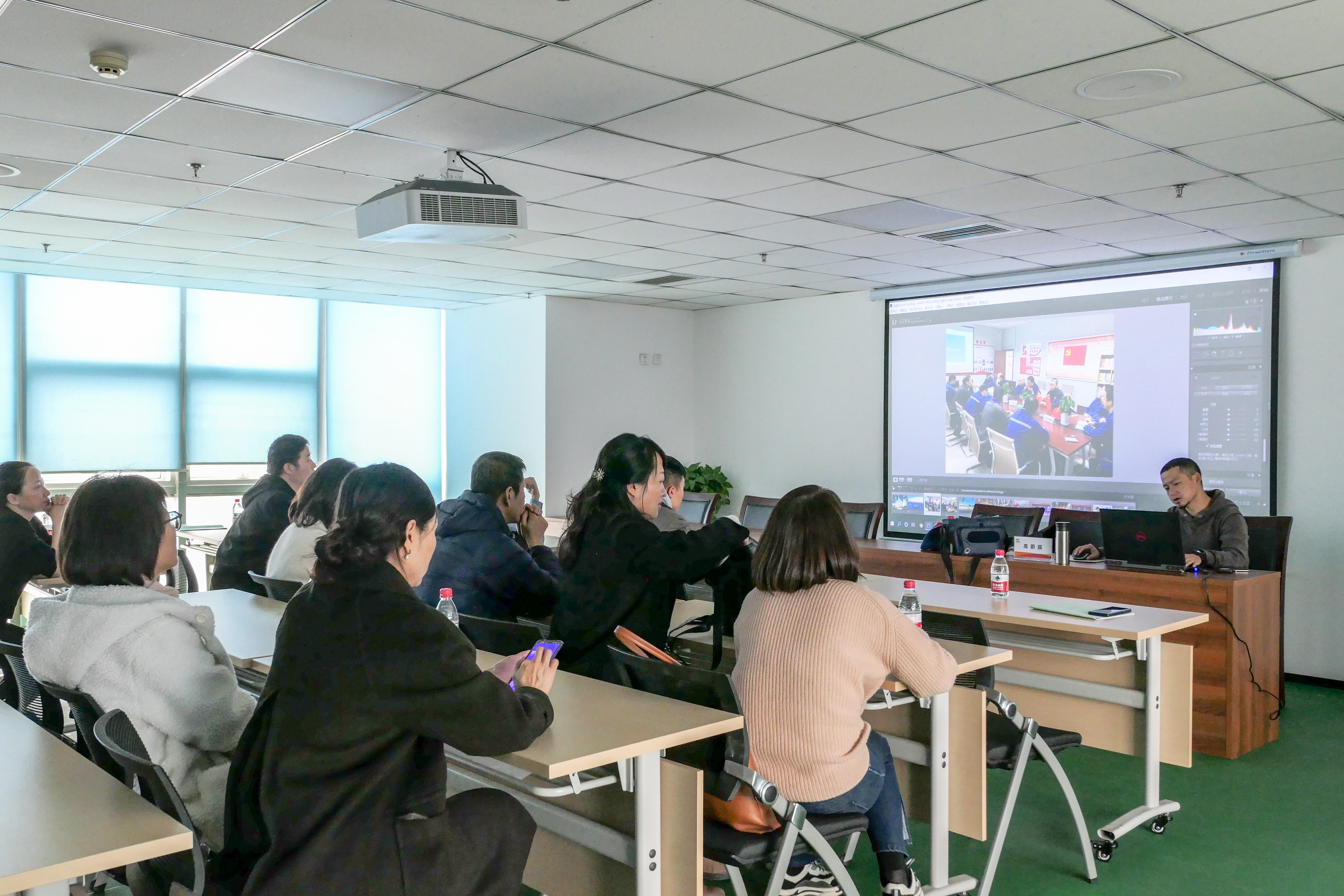 本次活動特別邀請高級攝影師、影視導(dǎo)演高蔚辰進(jìn)行了專題講座《攝影技能提升》。高老師教圍繞拍攝基本操作技巧、拍照構(gòu)圖要領(lǐng)、圖片修圖要領(lǐng)等相關(guān)內(nèi)容進(jìn)行授課,重點對拍攝照片的思路、拍照光影要領(lǐng)及會議拍攝技巧等方面進(jìn)行了精彩講解。通訊員們現(xiàn)場進(jìn)行會議照拍攝練習(xí),高老師對拍攝照片中存在的問題進(jìn)行一對一講解,使大家及時得到直觀高效的指導(dǎo)。