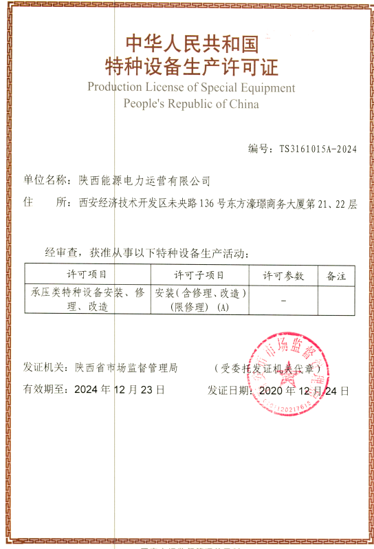 12月25日,從陜西省市場監(jiān)督管理局傳來喜訊,由我公司申請的承壓類特種設備安裝(限修理)(A)資質(zhì)成功獲批。該資質(zhì)是目前集團系統(tǒng)電力承壓設備檢修所取得的最高資質(zhì),標志著公司全面具備了參與電力檢修市場的資格,必將為企業(yè)拓展發(fā)展空間、加快市場化改革,打造“能源工匠 品質(zhì)運營”品牌,提供有力的支撐。